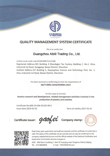 Abli Jewelry Factory upholds internationally recognized quality practices to ensure every piece reflects consistency, safety, and lasting craftsmanship trusted by global partners. We believe that every milestone begins with trust – and trust is earned through verified quality. Our certifications not only validate compliance but embody our enduring passion for the jewelry industry and the values that drive our continuous growth.