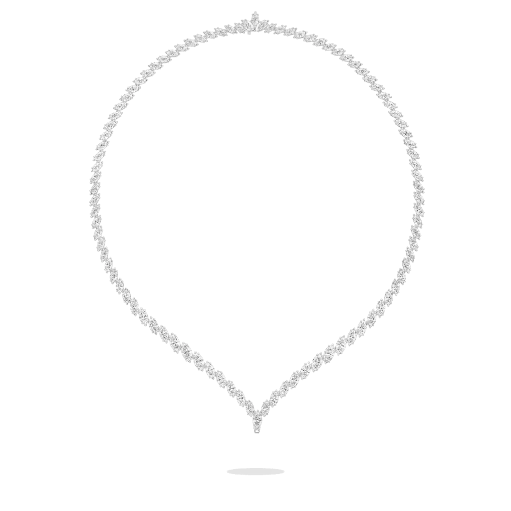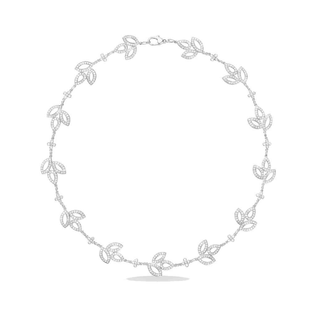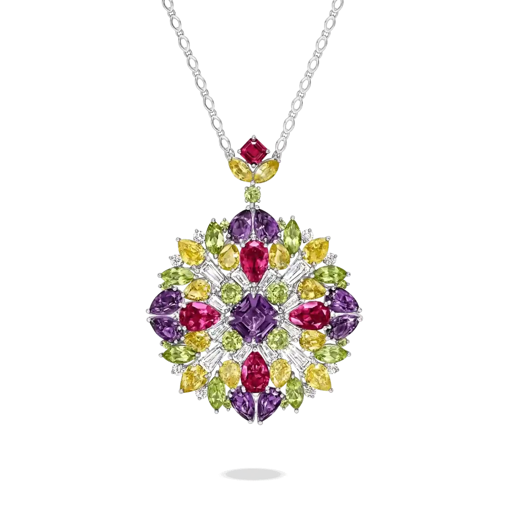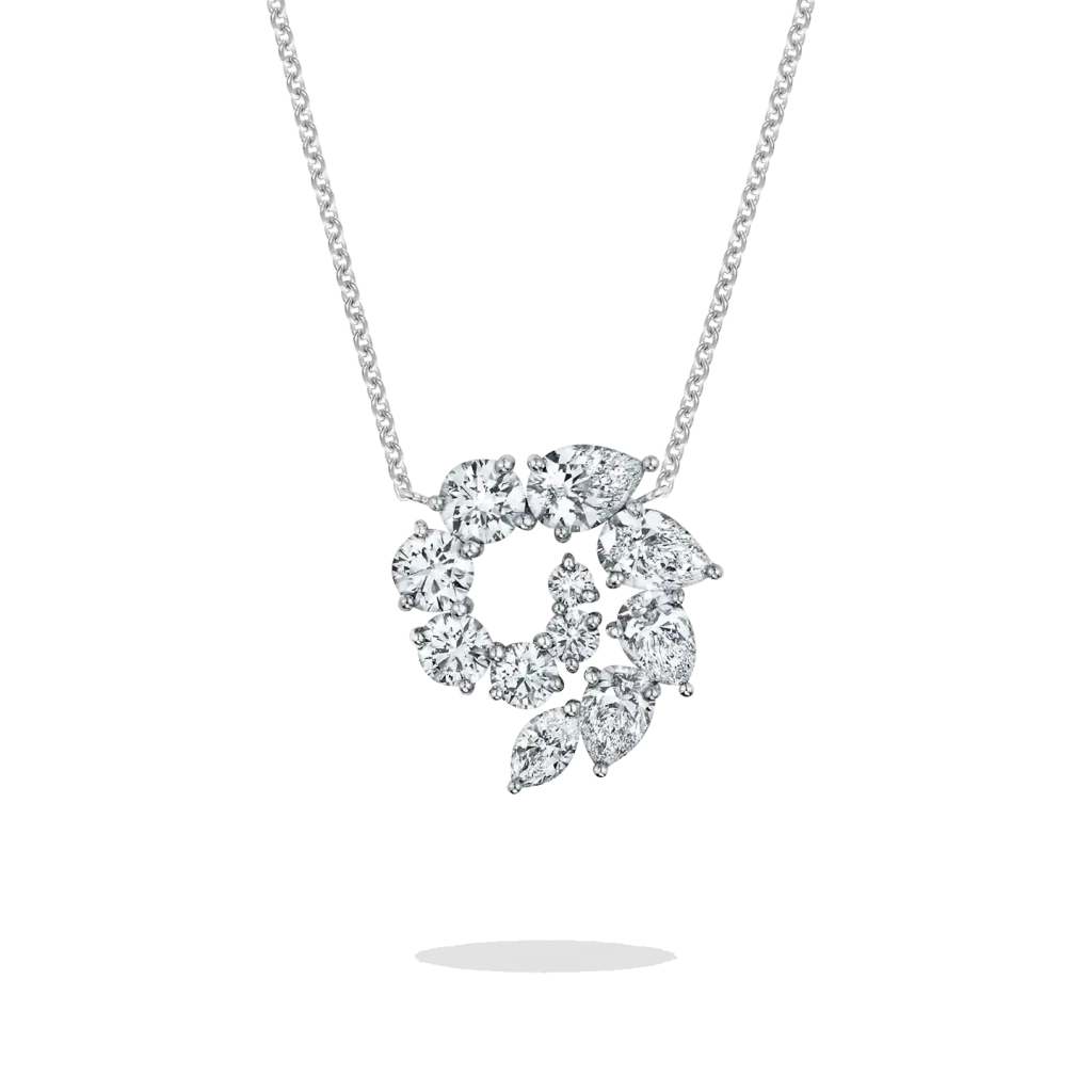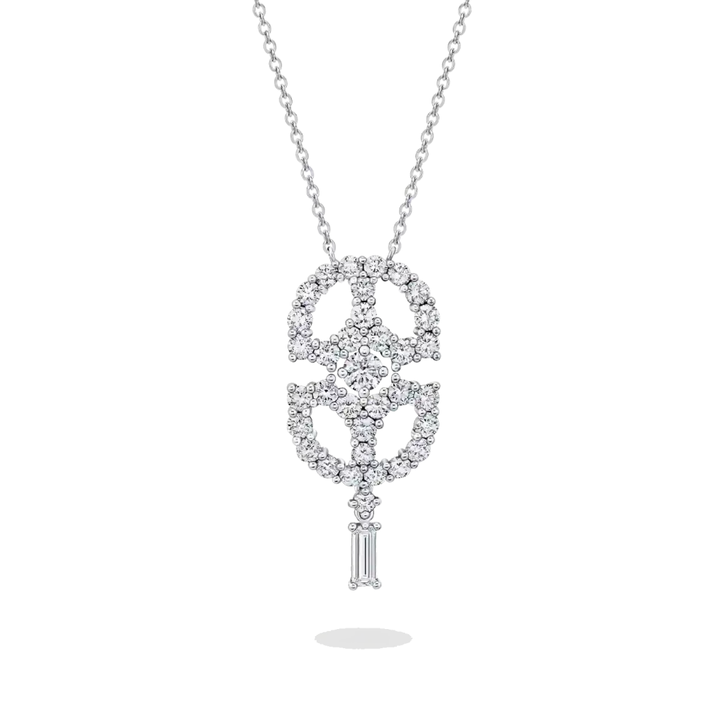 Abili’s diamond pendants, set in platinum or yellow gold, offer a more delicate interpretation of the House’s signature fine jewelry aesthetic.